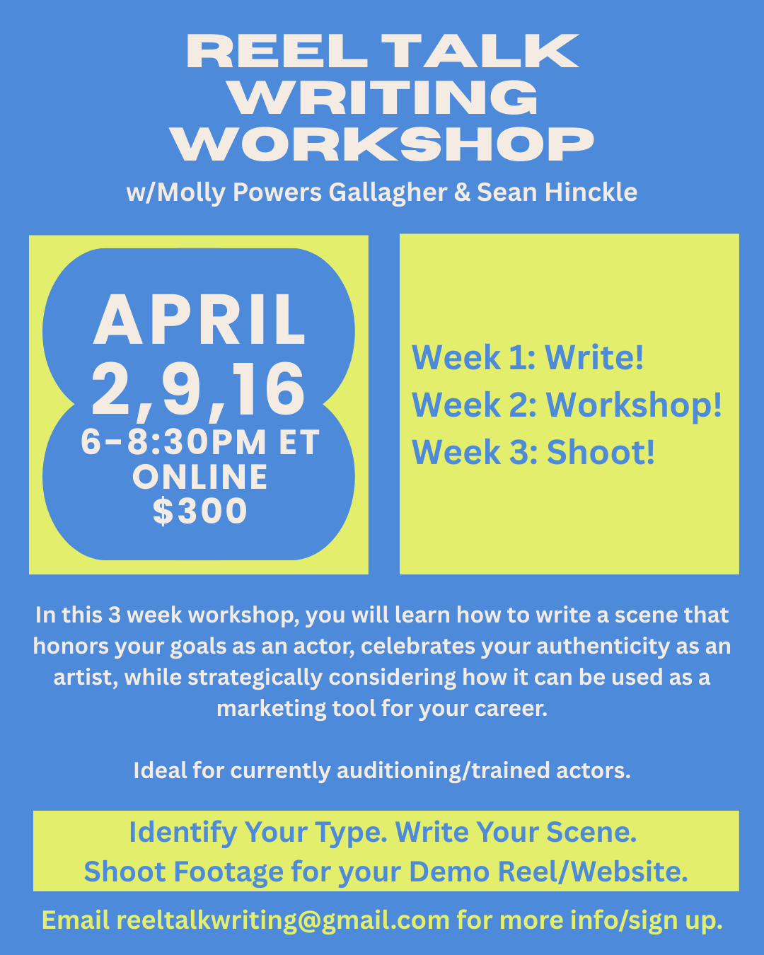 Email reeltalkwriting@gmail.com for more info.